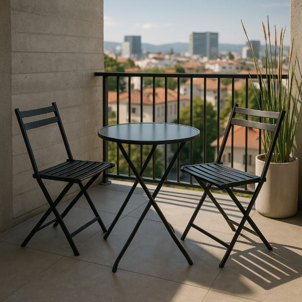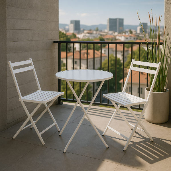 Diseñado para balcones, patios o terrazas, este combo combina resistencia, estilo y funcionalidad en un formato liviano y fácil de guardar.