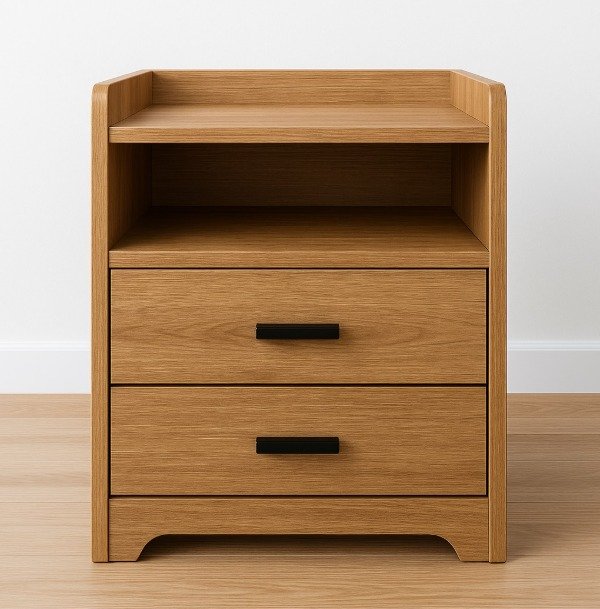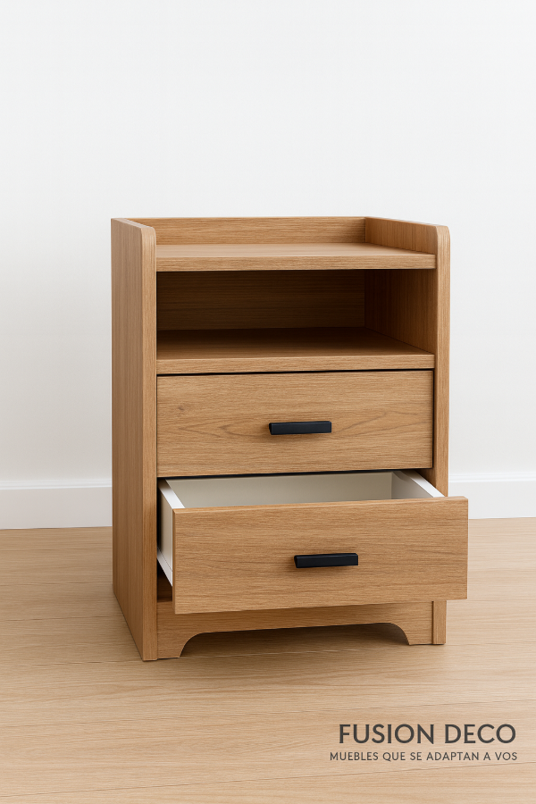 cuenta con dos amplios cajones con correderas metálicas y un nicho superior abierto, ideal para mantener tus objetos de uso diario al alcance de la mano.