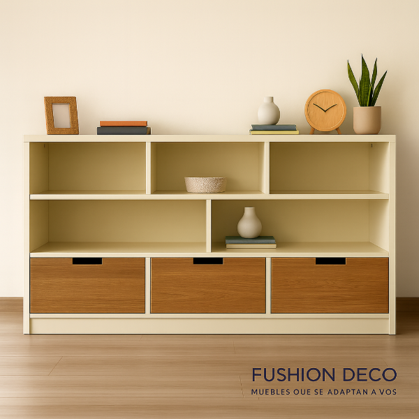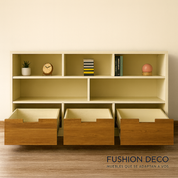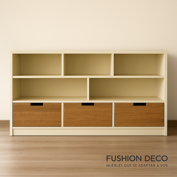 Este mueble de 1.60 m de ancho, 0.90 m de alto y 0.40 m de profundidad combina diseño moderno y funcionalidad. Fabricado en melamina color Blanca con frentes de cajones en Olmo Finlandés, ofrece tres amplios cajones con correderas telescópicas y seis espacios abiertos ideales para libros, decoración o electrónica. Su estilo minimalista y sus líneas limpias lo convierten en una pieza versátil, perfecta para living, dormitorio o espacio de trabajo.